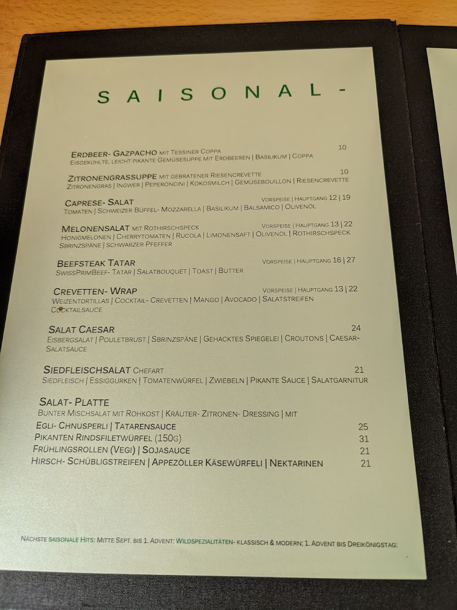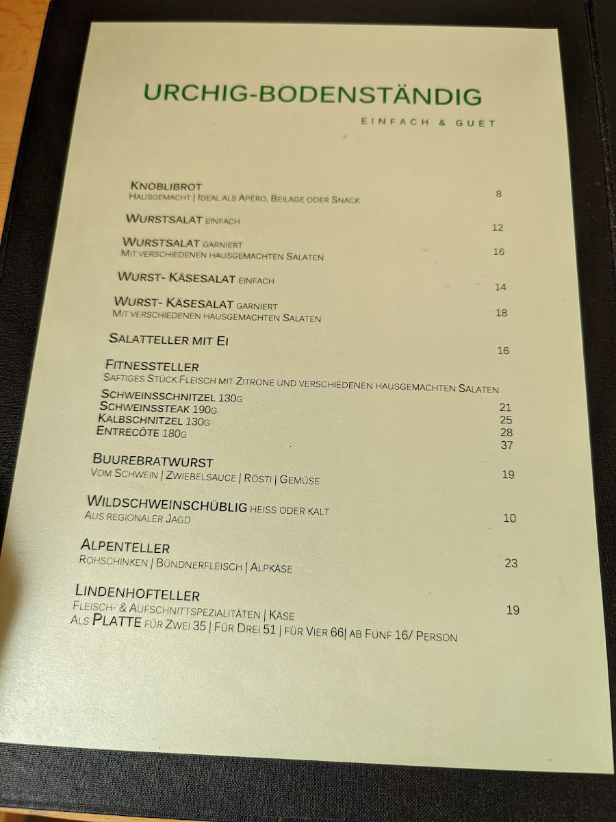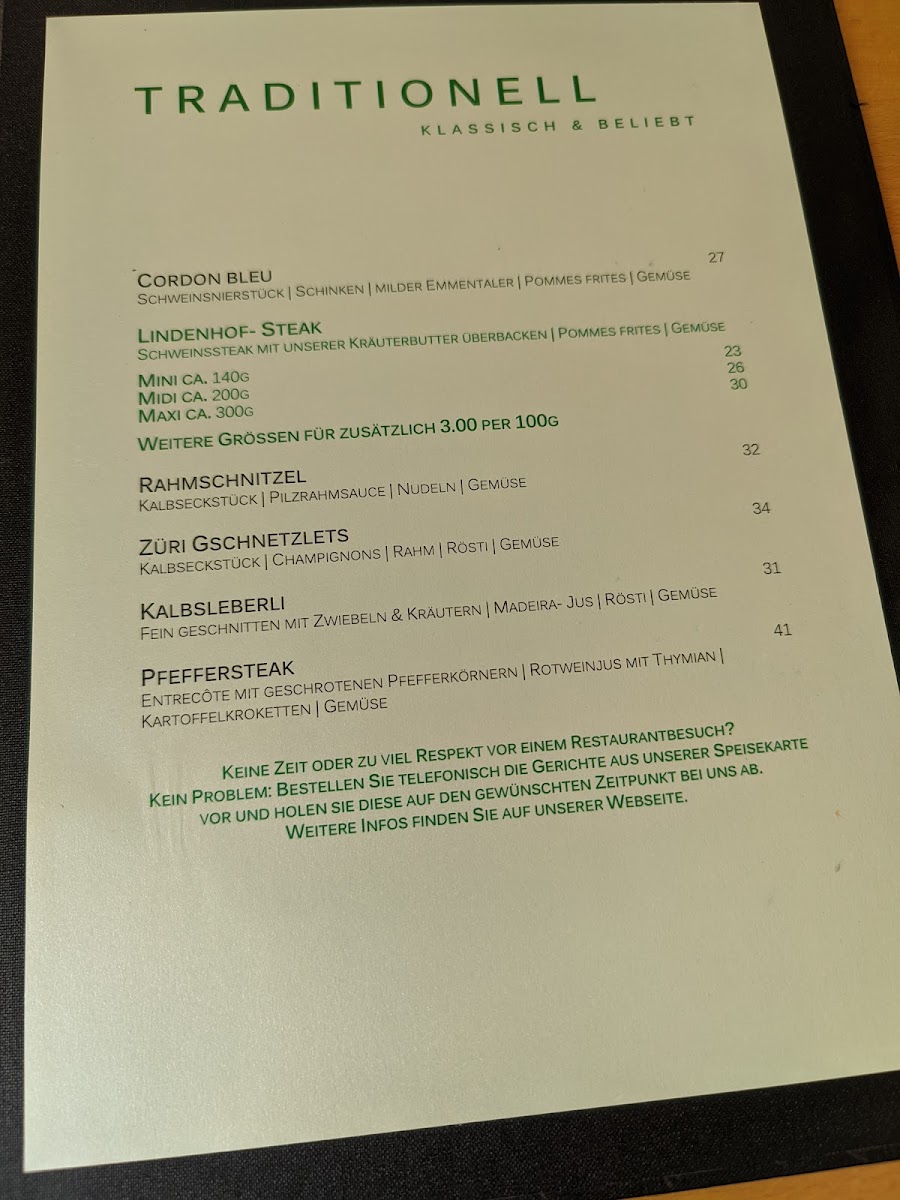 This menu offers something for everyone, from hearty meat dishes to fresh salads and indulgent desserts, making Wirtschaft Zum Lindenhof a great spot for a well-rounded meal in Switzerland.