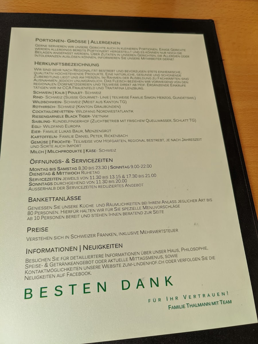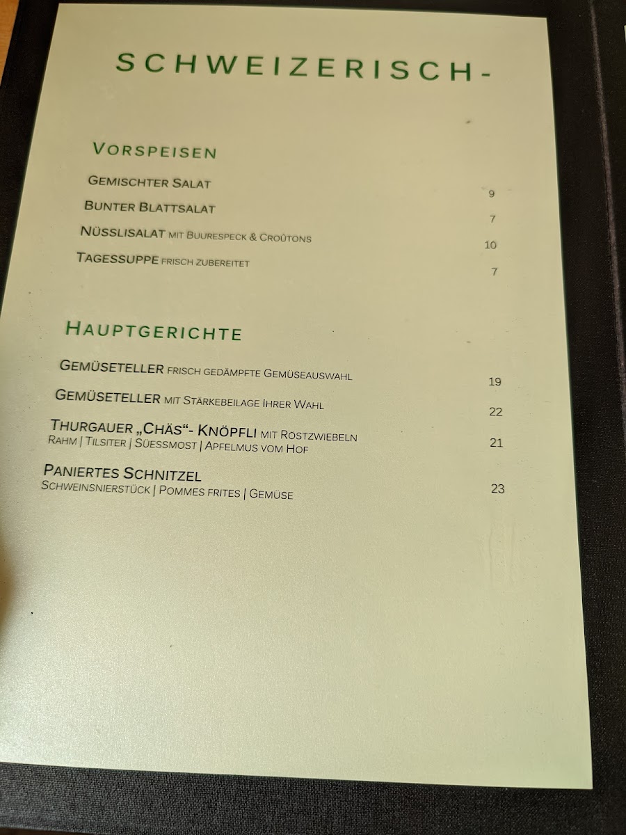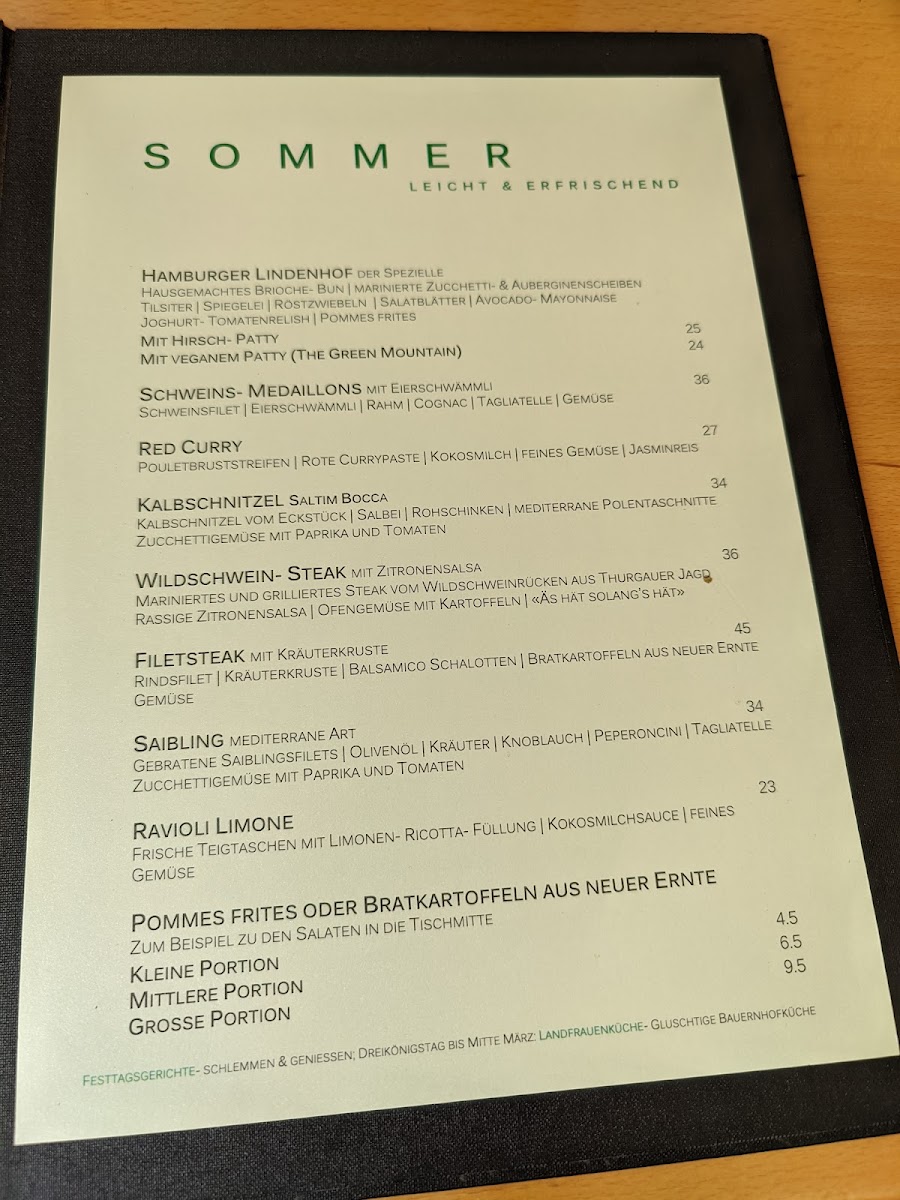 This menu offers something for everyone, from hearty meat dishes to fresh salads and indulgent desserts, making Wirtschaft Zum Lindenhof a great spot for a well-rounded meal in Switzerland.